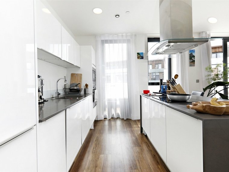 The apartment also benefits from a contemporary open-plan kitchen, complete with stone worktops, integrated appliances, and a central island unit.