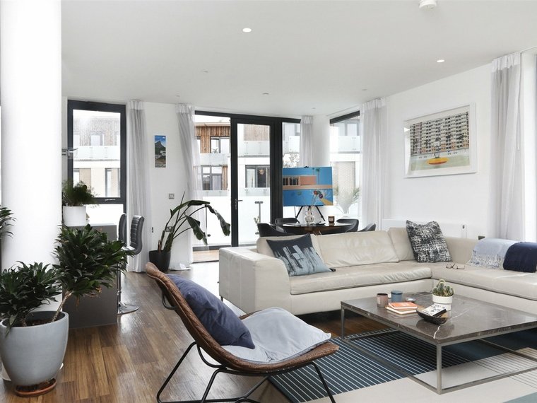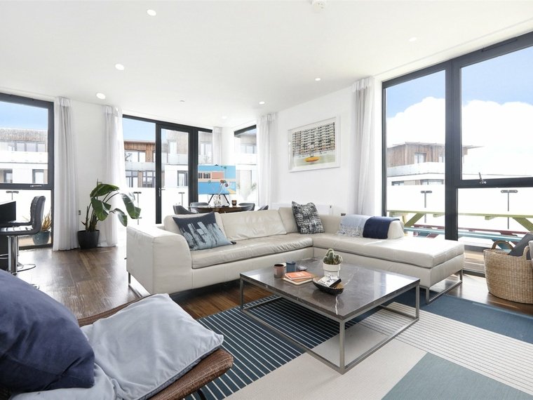 This exceptional flagship penthouse apartment, spanning an impressive 1,001 sq ft and positioned on the fourth floor of Sitka House, offers a rare triple-aspect layout and beautifully designed living space throughout. The property features a welcoming entrance area leading into a striking dual-aspect reception and dining room, enhanced by floor-to-ceiling windows that flood the space with natural light. Doors open directly onto a substantial private terrace extending to approximately 645 sq ft, ideal for entertaining or relaxing outdoors.